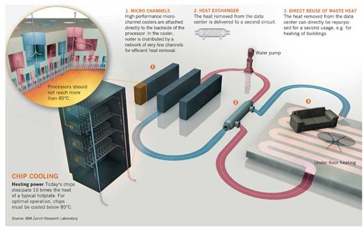IBM ha presentado para el ETH de Zúrich un ordenador refrigerado por agua caliente lo que logra dar un paso más a la concienciación del uso de la energía. Este sistema utiliza agua con una temperatura máxima de 60º C, lo que hace que ahorre un 40% de energía que un sistema de aire. Este sistema también desarrolla calor que se utiliza en edificios universitarios, reduciendo más el consumo.